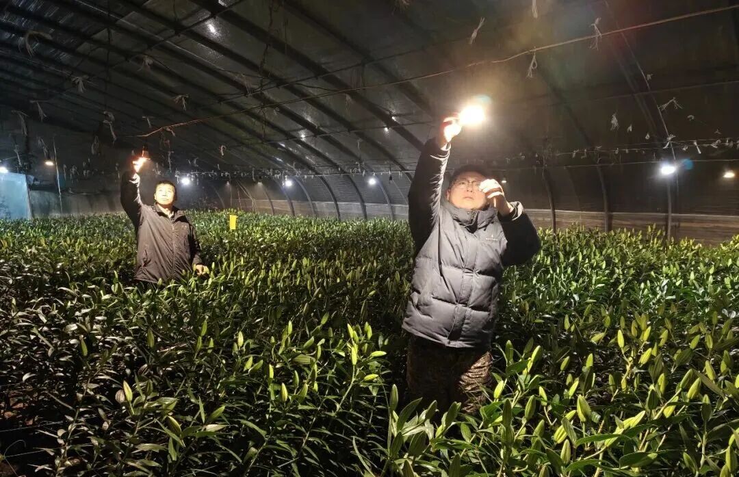 岗埠农场则聚焦高效农业示范园作物分类管护,组织人员对所有大棚骨架、保温棉被进行全面检修加固,为1.5万株百合花苗喷施抗逆性叶面肥,对西红柿苗开展精准打杈、浇水管理,提前准备40余台套热风机、水源热泵等加温设备,其中31号大棚通过水源热泵将夜间温度稳定在16.5℃,有效保障作物生长关键期需求。