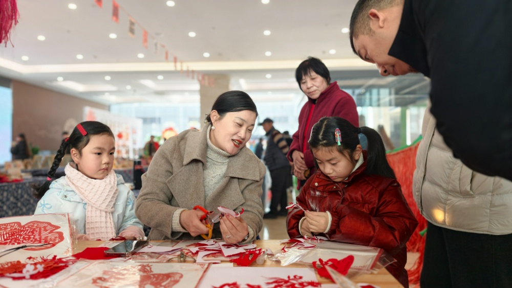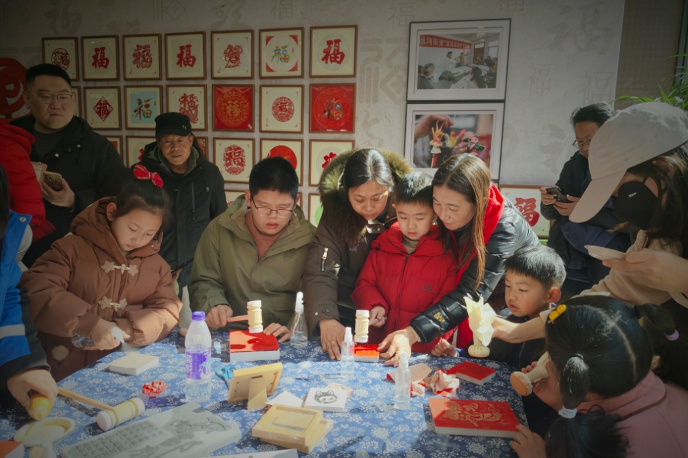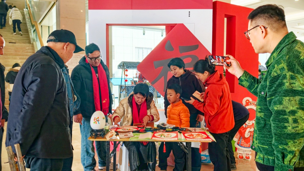 为让非遗可感可触、可亲可近,邳州市文化馆在现场专设互动体验区,市民游客亲手参与拓印、剪纸、花鸟字等民俗技艺,沉浸式感受非遗魅力。
