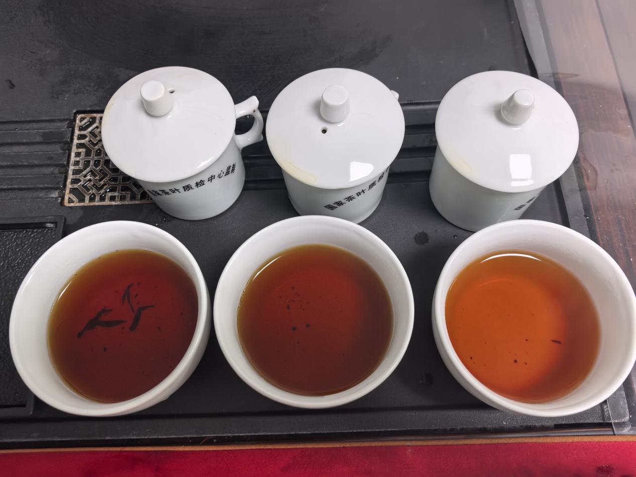 △开汤评审从左到右依次为:云南临沧大叶种红茶“小桃红”、十里宁浦红常规红茶、十里宁浦红草莓红茶