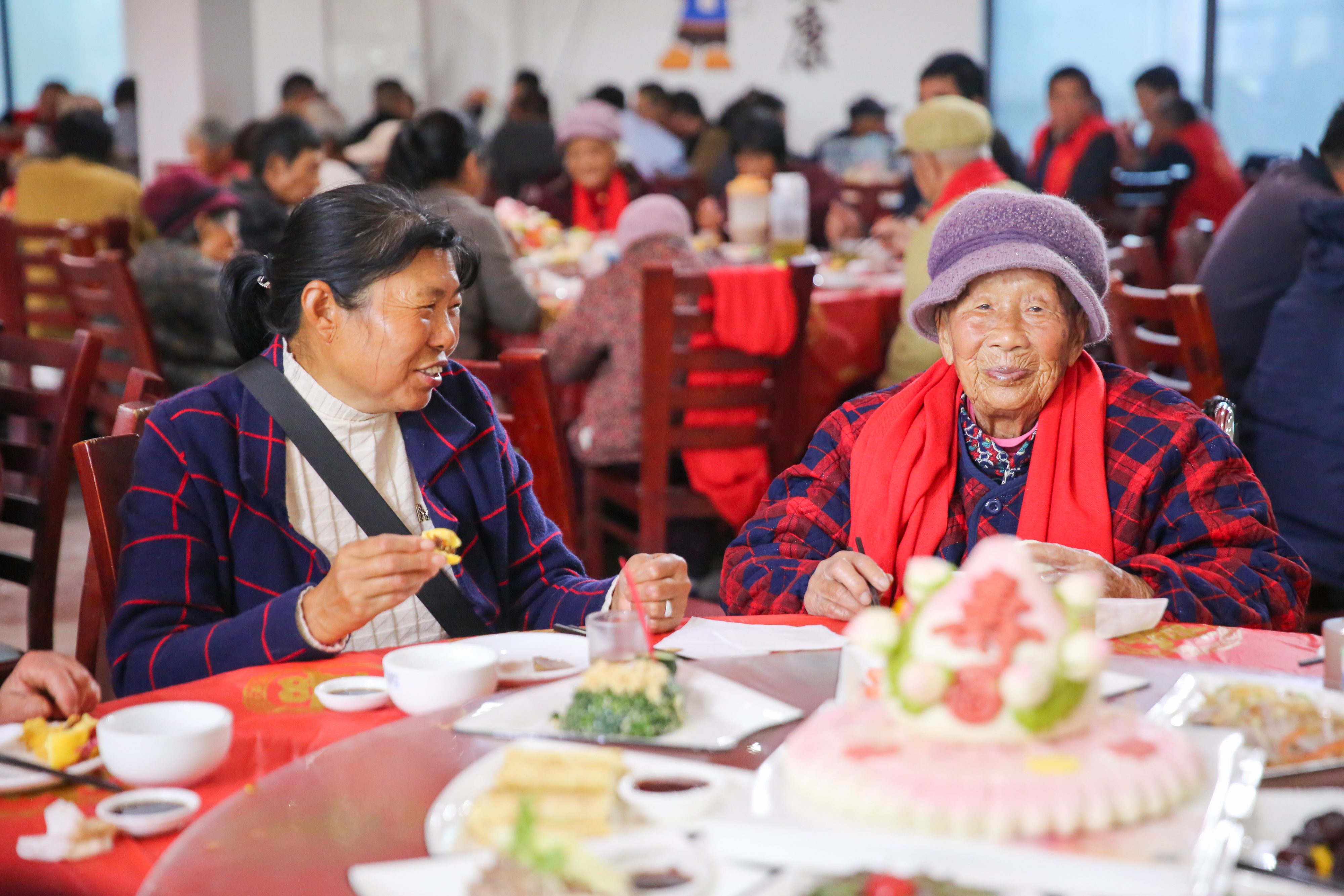 宴聚团圆,礼敬寿星。作为活动的“重头戏”,百岁宴在《百善孝为先》的悠扬旋律中温馨开席。老人们与家属、工作人员围坐一桌,品尝热乎饭菜,畅谈家常,团圆的氛围感染着在场每一个人。宴席尾声,社区还为每位90周岁及以上老人送上“心意礼包”,礼包内装满实用好物,既是节日的礼物,更是社区对老人们沉甸甸的牵挂。