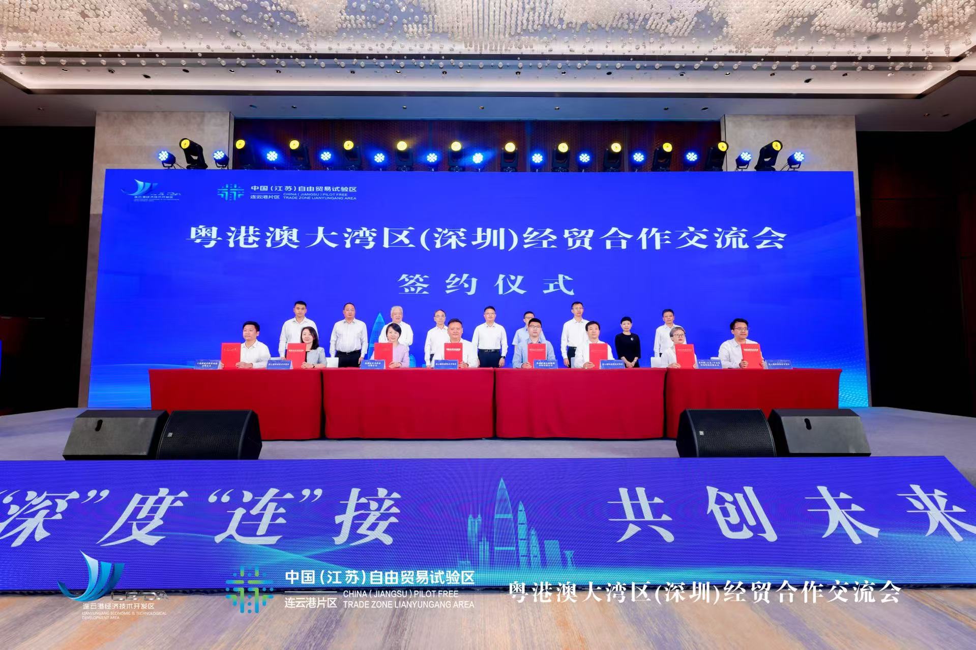 跨越湾区山海,共启合作新篇!10月16日下午,连云港经济技术开发区、江苏自由贸易试验区连云港片区粤港澳大湾区经贸合作交流会在深圳成功举行。活动现场签约7个产业项目、总投资75亿元;1个大宗贸易项目、年贸易额150亿元;1个总部经济项目、年营业额35亿元,以亮眼“成绩单”奏响两地产业协同、资源对接的合作强音。连云港市委常委、开发区党工委书记商振江,连云港市商务局副局长孙瑾出席并致辞,开发区党工委委员、管委会副主任赵晖主持会议。连云港市有关部门、连云港开发区和企业嘉宾共130余人参加推介、洽谈活动。