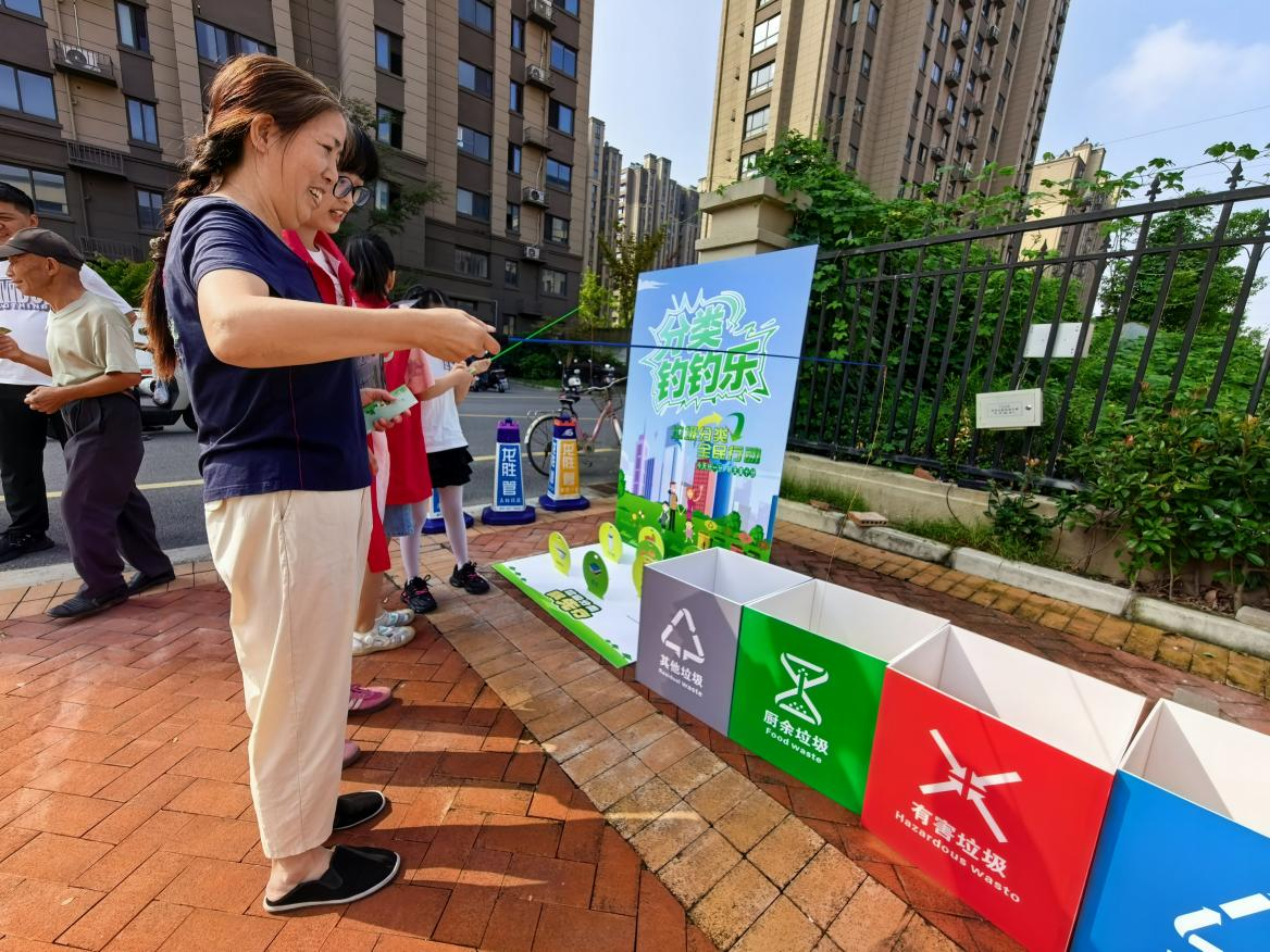 为让垃圾分类融入生活场景,社区将宣传引导从“纸上”搬到“身边”。海洪社区在居民每日必经的广场、楼道,设置“分类钓钓乐”情境游戏,居民化身“神钓手”将“鸡蛋壳”等垃圾“钓”进对应分类框,在互动中巩固认知;同时增设科普景观小品与固定式标语,让公共空间成为“永不下班的指导员”。针对腿脚不便的独居老人,社区还开通“爱分类”上门服务,老人只需在微信群@党员先锋代表,就能获得一对一投放指导,精准解决特殊群体的分类难题,让习惯培养更有温度。