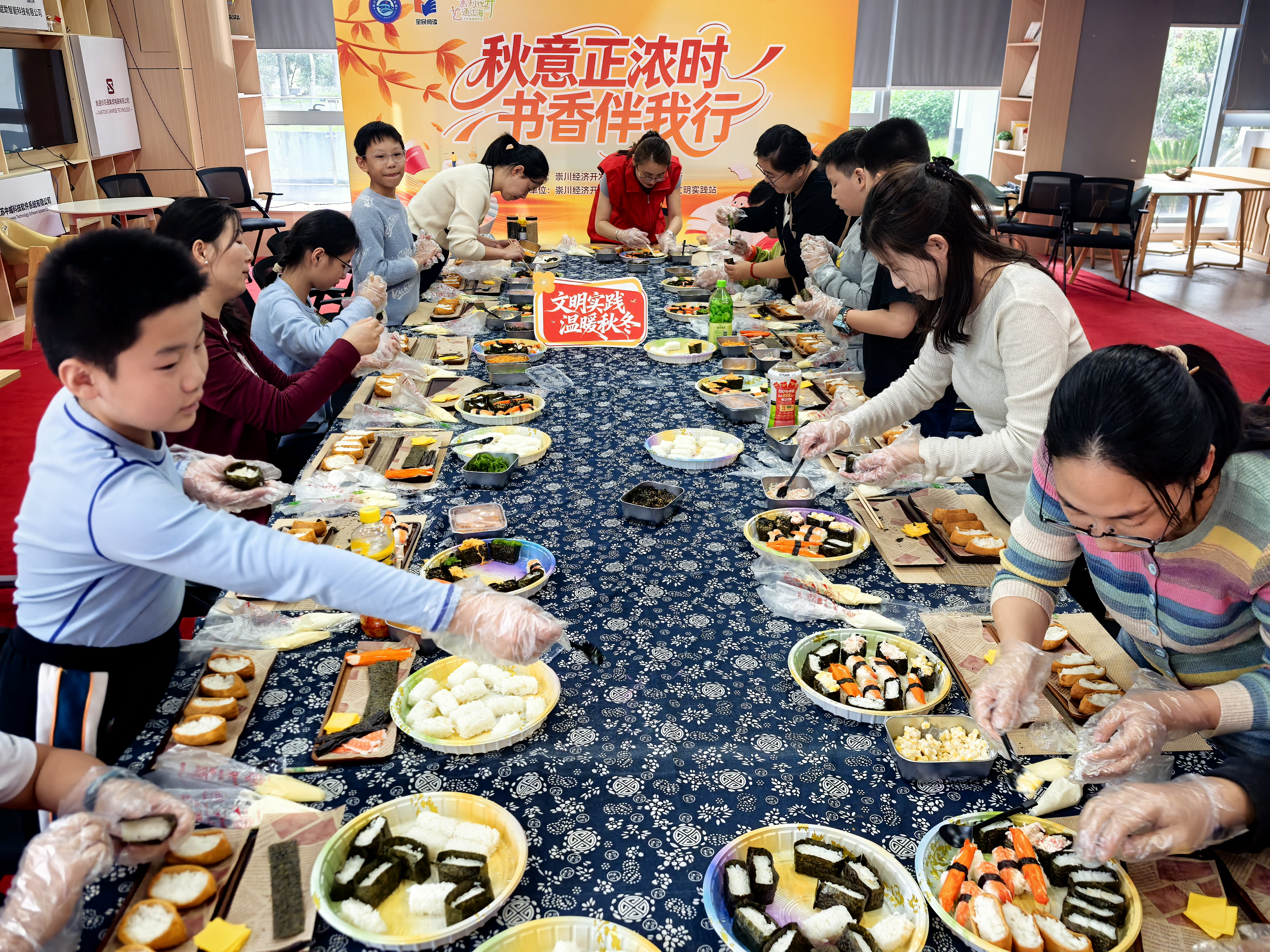 巧手寻味,乐享实践之趣。“寿司起源于中国,最早可以追溯到东汉末年,百姓为了逃荒和方便携带,发明了寿司……”志愿者一边讲述寿司的历史渊源与文化脉络,一边指导亲子家庭体验寿司制作。从米饭的软硬把控到海苔的铺展技巧,从食材的搭配创意到卷切的细致操作,每一步都耐心示范、细致讲解。家长与孩子分工协作、动手尝试,在揉、铺、卷、切的过程中,体会饮食文化的独特韵味,更在分享成品、交流心得的欢声笑语中,传递秋冬里的温暖情谊。