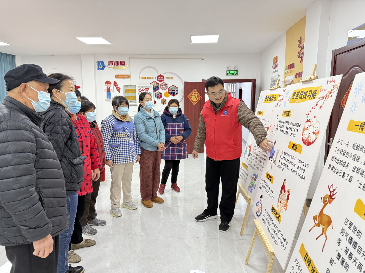 活动伊始,活动现场早已聚集了不少居民,图文展板以清晰的脉络,从冬至的起源传说到节气物候特点。志愿者从古代先民观测日影、确立节气,到“阴极之至,阳气始生”的自然哲思,再到历代宫廷与民间的祭天、贺冬仪式,居民们跟随讲解,感受着节气文化的深厚底蕴。“圆”是绝对的主角,展板上,洁白圆润的汤圆寓意着“团团圆圆”“美满圆满”。志愿者详细讲解了本地汤圆的制作传统:从选用上好的水磨糯米粉,到调制芝麻、豆沙等经典馅料,再到搓圆时融入的美好祝愿。居民们听得入神,尤其是一些年轻人,第一次了解到,手中那枚小小的汤圆,竟包裹着如此丰富的文化密码与情感寄托。“原来冬至不止于日历上的标记,它更连着祖先的智慧、土地的脉动与家庭的温情。”居民钱银银感慨道。