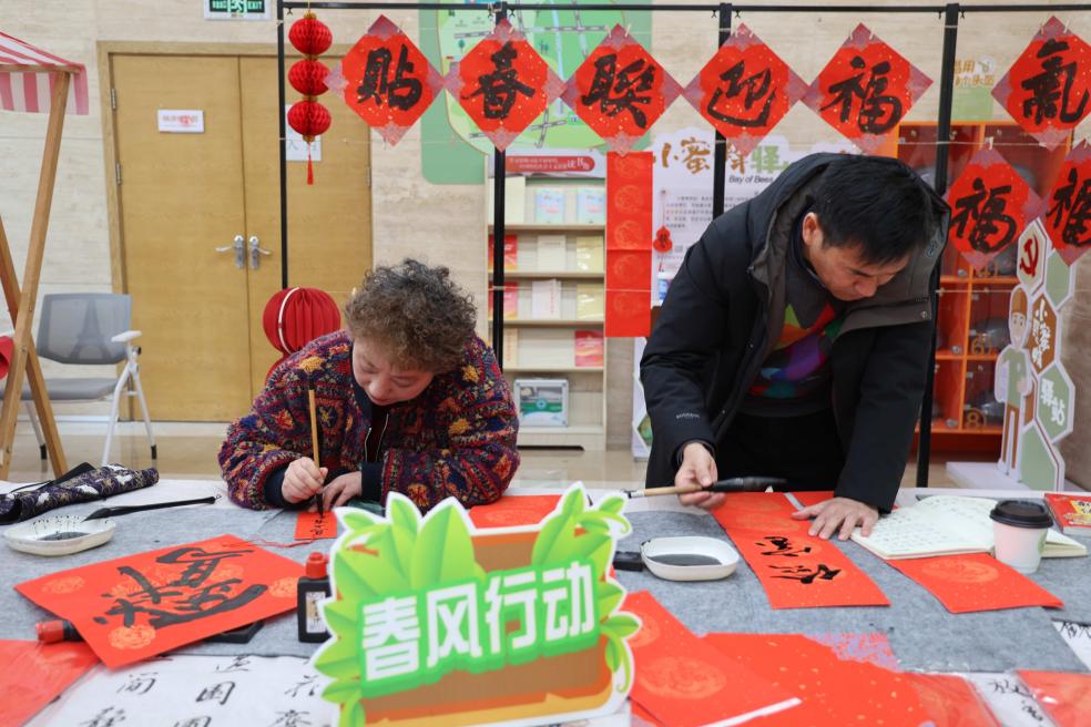 活动紧扣“年味+书香”主题,将非遗文化与全民阅读深度融合,让传统韵味浸润书香。“书香迎马年”打卡墙前,骑手与小哥纷纷驻足留影,笑脸与春联诗句相映,定格对新春的期盼。非遗体验区内,宋锦华美纹样与精致的马年烧箔交相辉映,工作人员生动讲述非遗技艺的渊源与传承。民盟书法家现场挥毫,一幅幅吉祥春联、一个个饱满“福”字新鲜出炉,墨香中裹挟着满满的祝福。