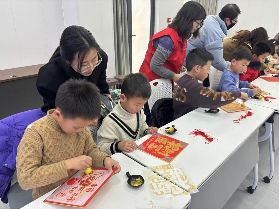 恰逢腊八佳节,活动在非遗拓印福字体验中继续延伸,孩子们在志愿者们的指导下铺纸、蘸墨、按压,亲手制作专属新春福字,于动手实践中感受传统文化魅力,脸上满是自豪与喜悦。随后,崇川区出版版权科科长张玉涛带领大家观看《全民阅读条例》宣传视频,并为孩子们送上装满经典书籍与学习用品的书香礼包,叮嘱他们以读增智、以书润心,社区书记黄敏也与大家一起分享了社区“书语微光”公益阅读项目的初衷与规划,并表示社区将以文化赋能为抓手,提升软实力,构建“全民阅享书香,万家浸润文韵”的和谐格局。