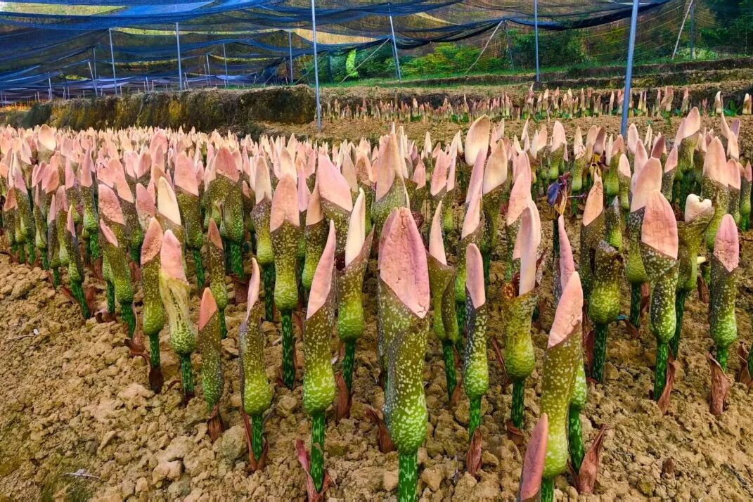 更大的突破在于繁殖技术的革新。传统魔芋靠地下块茎繁殖,系数仅为3-6倍,且易导致病毒累积和连作障碍。赵建荣团队首创“珠芽金魔芋三倍体无性生殖”技术,实现了从“地下结果”到“叶上结籽”的革命性转变。“这就像找到了魔芋界的‘雄性败育系’,”赵建荣比喻道,通过人工诱导和生物技术,他们将魔芋繁殖系数提升至惊人的300-900倍,从根本上破解了种源瓶颈,为规模化、标准化种植奠定了坚实基础。